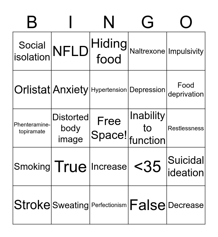 This bingo card has a free space and 31 words: Perfectionism, Puberty, Distorted body image, <45, Social isolation, Hiding food, Anxiety, <35, Inability to function, False, Restlessness, Decrease, Laxative Use, Body dissatisfaction, Food deprivation, Eye contact, Suicidal ideation, True, Smoking, Increase, Impulsivity, Schizophrenia, Stroke, NFLD, Depression, Orlistat, Naltrexone, Phenteramine- topiramate, Sweating, Hypertension and Hypotension.