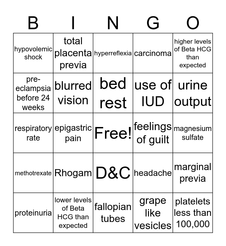 This bingo card has a free space and 29 words: proteinuria, vaginal bleeding before 20 weeks, epigastric pain, cerclage, hypovolemic shock, hyperreflexia, blurred vision, Rhogam, feelings of guilt, lower levels of Beta HCG than expected, magnesium sulfate, platelets less than 100,000, fallopian tubes, grape like vesicles, urine output, elevated liver enzymes, D&C, methotrexate, higher levels of Beta HCG than expected, respiratory rate, headache, missed abortion, use of IUD, pre-eclampsia before 24 weeks, carcinoma, total placenta previa, marginal previa, bed rest and perinatal death.