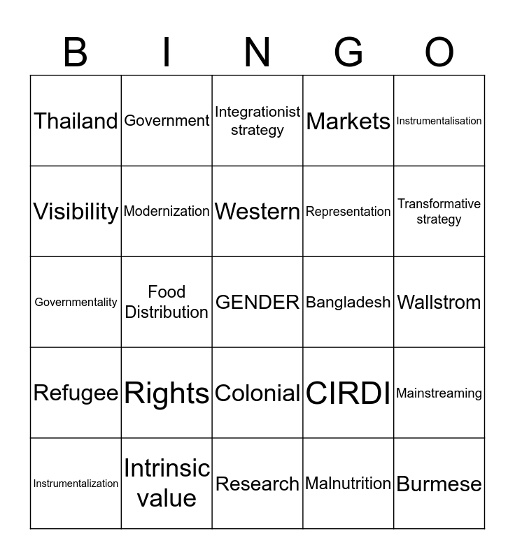This bingo card has a free space and 35 words: Us vs. Them, World Bank, Structural Adjustment Programs, Modernization, Colonial, Markets, Visibility, Third World, Western, Empowerment, Governmentality, Instrumentalisation, Neoliberal, Efficiency, Thailand, Bangladesh, Malnutrition, Food Distribution, Refugee, Burmese, CIRDI, Instrumentalization, Mainstreaming, Intrinsic value, Integrationist strategy, Transformative strategy, Policy-making, Cosmopolitan, Representation, Wallstrom, Equity, Research, Rights, Government and Feminist.