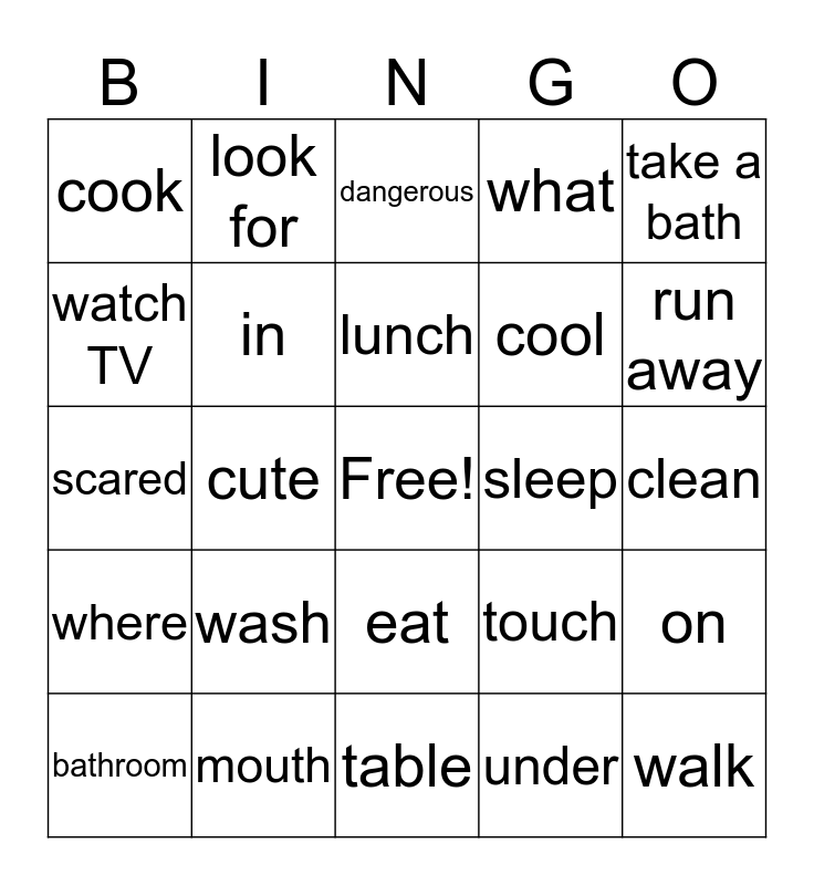 This bingo card has a free space and 24 words: wash, mouth, lunch, bathroom, take a bath, cook, watch TV, look for, sleep, eat, cool, scared, touch, on, in, under, clean, dangerous, run away, cute, walk, where, what and table.