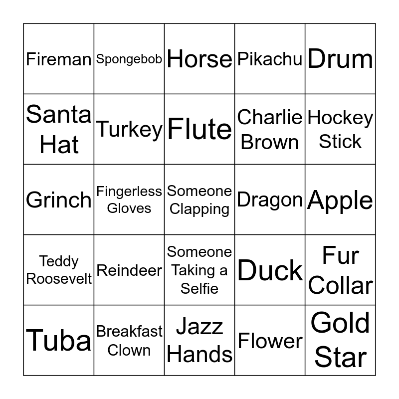 This bingo card has 100 words: Acorn, Airplane, Apple, Astronaut, Autumn Leaf, Baseball, Big Bird, Bike, Black Eyed Peas, Black Hat, Black Vest, Blue Star, Bowling Pin, Breakfast Clown, Candy Cane, Carrot, Charlie Brown, Christmas Tree, Clown, Clown with Blue Hair, Cornucopia, Crying Kid, Cupcake, Dinosaur, Dog, Dragon, Drum, Duck, Earmuffs, Elf, Fingerless Gloves, Fireman, Flag, Flamingo, Flower, Flute, Fur Collar, Giraffe, Goku, Gold Star, Green Eggs and Ham, Green Giant, Grinch, Guitar, Hockey Stick, Horse, Hot Air Balloon, Ice Cream Cone, Ice Skater, Jazz Hands, Marching Band from Florida, Marching Band from Kentucky, Marching Band from Maryland, Marching Band from Missouri, Marching Band from Texas, Mouse, Nose Picker, Nutcracker, Olaf, Pikachu, Pilgrim, Pillsbury Doughboy, Pom Pom, Power Ranger, Present, Pumpkin, Red Bow, Red Gloves, Red Scarf, Red Shoe, Red Star, Reindeer, Rockette, Rocking Chair, Ronald McDonald, Sailboat, Santa Claus, Santa Hat, Smokey Bear, Snoopy, Snowman, Someone Clapping, Someone Drinking a Hot Beverage, Someone Taking a Selfie, Someone Watching From a Window, Spongebob, Starflakes, Striped Scarf, Suspenders, Teddy Roosevelt, Top Hat, Troll, Trombone, Tuba, Turkey, Turtle, White Coat, White Gloves, White Hat and Wreath.