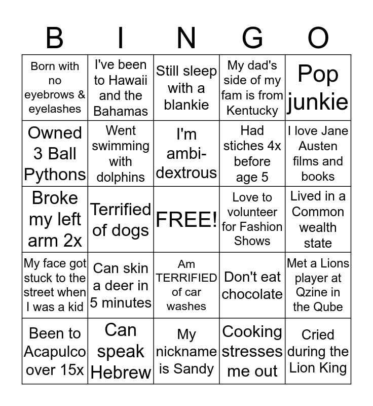 This bingo card has a free space and 24 words: Can skin a deer in 5 minutes, Can speak Hebrew, I'm ambi-dextrous, Been to Acapulco over 15x, Pop junkie, Born with no eyebrows & eyelashes, Owned 3 Ball Pythons, I've been to Hawaii and the Bahamas, Love to volunteer for Fashion Shows, Am TERRIFIED of car washes, Had stiches 4x before age 5, Broke my left arm 2x, Don't eat chocolate, Met a Lions player at Qzine in the Qube, Went swimming with dolphins, Cooking stresses me out, Lived in a Common wealth state, Still sleep with a blankie, I love Jane Austen films and books, Terrified of dogs, Cried during the Lion King, My face got stuck to the street when I was a kid, My dad's side of my fam is from Kentucky and My nickname is Sandy.