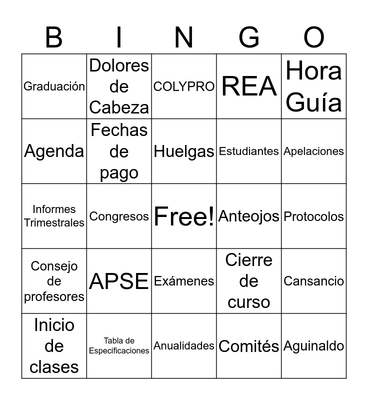 This bingo card has a free space and 31 words: Inicio de clases, Indicadores, Huelgas, Horario, Hora Guía, Graduación, Fechas de pago, Exámenes, Estudiantes, Estrés, Consejo de profesores, Congresos, Concentrados, Comités, Cansancio, Calendario Escolar, APSE, Anualidades, Anteojos, Aguinaldo, Agenda, Tabla de Especificaciones, Rúbricas, REA, Protocolos, Informes Trimestrales, Dolores de Cabeza, COLYPRO, Cierre de curso, Apelaciones and ANDE.