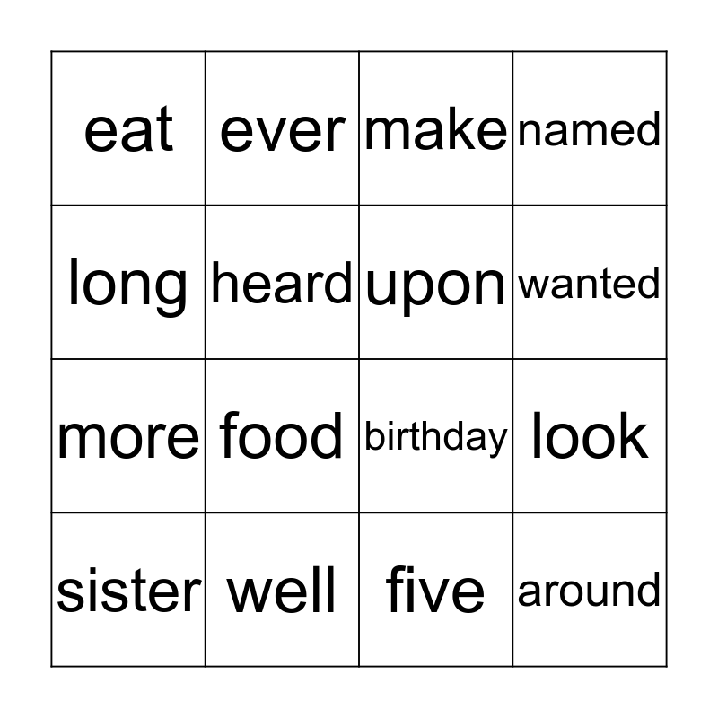 This bingo card has 20 words: look, still, make, playing, sister, long, well, eat, more, ever, food, birthday, heard, around, upon, named, wanted, named, five and here.