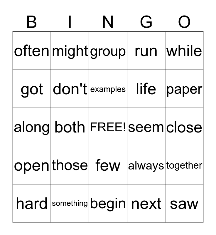 This bingo card has a free space and 24 words: those, something, examples, hard, while, often, got, might, seem, few, life, along, always, together, don't, next, close, group, paper, both, saw, open, run and begin.