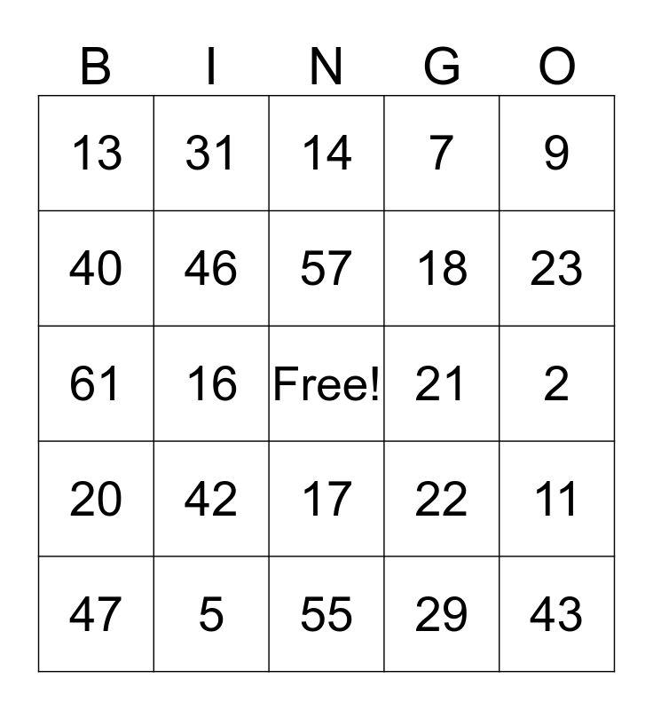 This bingo card has a free space and 70 words: 1, 2, 3, 4, 5, 6, 7, 8, 9, 10, 11, 12, 13, 14, 15, 16, 17, 18, 19, 20, 21, 22, 23, 24, 25, 26, 27, 28, 29, 30, 31, 32, 33, 34, 35, 36, 37, 38, 39, 40, 41, 42, 43, 44, 45, 46, 47, 48, 49, 50, 51, 52, 53, 54, 55, 56, 57, 58, 59, 60, 61, 62, 63, 64, 65, 66, 67, 68, 69 and 70.