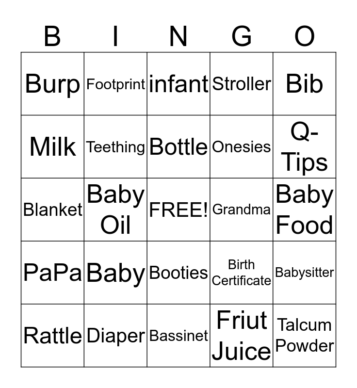 This bingo card has a free space and 24 words: Baby, Diaper, Bottle, Rattle, Bib, Burp, Milk, Footprint, Grandma, Booties, Onesies, Blanket, Birth Certificate, Babysitter, Teething, Friut Juice, Baby Food, infant, Q-Tips, Baby Oil, Talcum Powder, PaPa, Stroller and Bassinet.