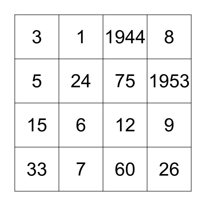 This bingo card has 36 words: 14, 35, 215, 75, 11, 26, 1953, 29, 5, 10, 9, 8, 28, 7, 6, 3, 1969, 50, 33, 1944, 60, 25, 13, 45, 69, 1, 12, 31, 15, 24, 39, 40, 227, 4, 2 and 1947.
