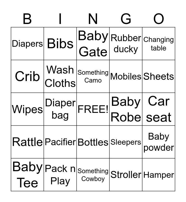 This bingo card has a free space and 67 words: Baby bathtub, Baby monitors, Baby ointment, Baby powder, Baby shampoo, Bassinet, Bibs, Blankets, Something Camo, Booties, Bottles, Burp cloths, Car seat, Changing table, Cradle, Crib, Diaper bag, Diapers, High chair, Mobiles, Pacifier, Rattle, Rubber ducky, Stroller, Teething rings, Toys, Changing pad, Teddy Bear, Sheets, Hangers, Hamper, Bottle Brush, Bottle Warmer, Nursing Pillow, Onesies, Baby Tee, Baby Pants, Sleepers, Wipes, Baby Lotion, baby Body Wash, Wash Cloths, Baby Robe, Hooded Towel, Play Mat, Bouncer, Carrier, Pack n Play, Bottle Bag, Outlet Caps, Baby Gate, Picture Frame, Baby Album, Baby Book, Something Orange, Something Cowboy, Diaper Pail, Baby Spoons, Nail Clippers, Wash Mitt, Infant Body Support, Sun Shade, Swing, Baby Hat, Walker, Diaper Stacker and Thermometers.