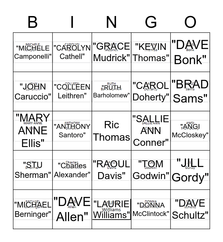 This bingo card has 24 images, a free space and 24 words: "Charles Alexander", "DAVE Allen", "RUTH Barholomew", "MICHAEL Berninger", "DAVE Bonk", "MICHELE Camponelli", "JOHN Caruccio", "CAROLYN Cathell", "SALLIE ANN Conner", "RAOUL Davis", "CAROL Doherty", "MARY ANNE Ellis", "TOM Godwin", "JILL Gordy", "COLLEEN Leithren", "DONNA McClintock", "ANGI McCloskey", "GRACE Mudrick", "BRAD Sams", "ANTHONY Santoro", "DAVE Schultz", "STU Sherman", "KEVIN Thomas" and "LAURIE Williams".