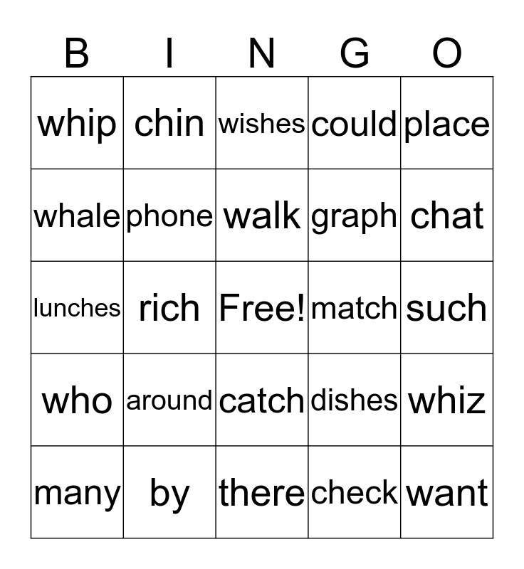 This bingo card has a free space and 24 words: around, by, walk, many, place, whip, whale, chin, match, catch, graph, lunches, dishes, whiz, phone, check, such, wishes, chat, rich, want, who, could and there.