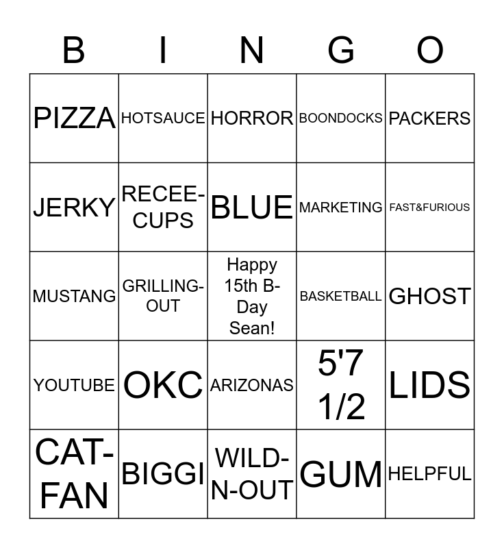 This bingo card has a free space and 24 words: OKC, BIGGI, BLUE, CAT-FAN, PACKERS, PIZZA, JERKY, HOTSAUCE, BASKETBALL, ARIZONAS, MARKETING, MUSTANG, 5'7 1/2, LIDS, RECEE-CUPS, GUM, GHOST, HORROR, FAST&FURIOUS, GRILLING-OUT, HELPFUL, YOUTUBE, BOONDOCKS and WILD-N-OUT.