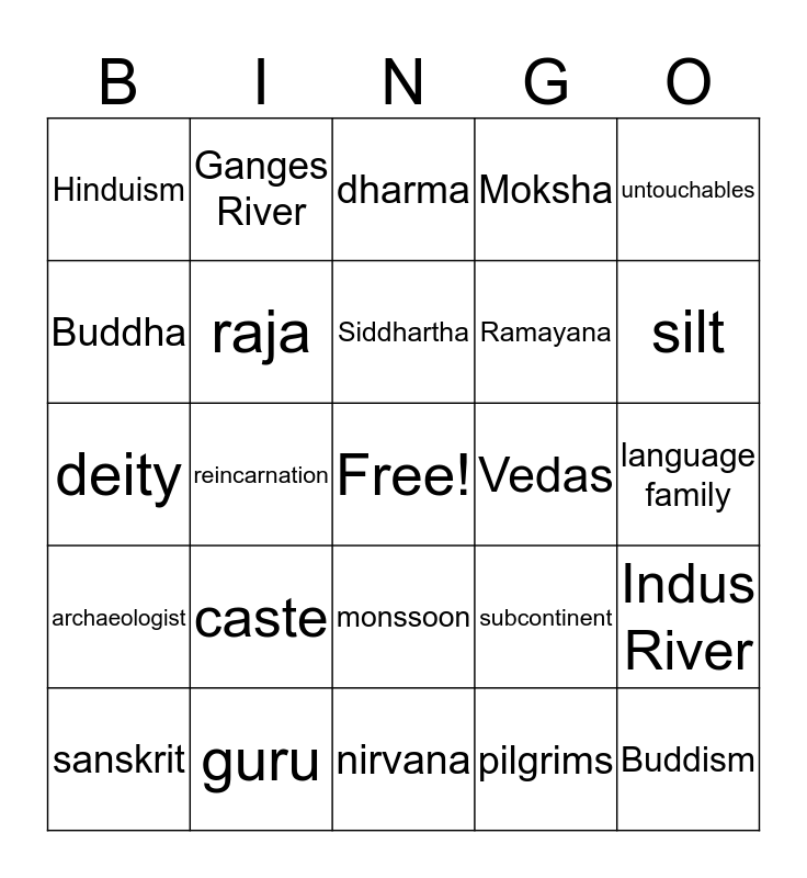 This bingo card has a free space and 29 words: sanskrit, karma, reincarnation, Braham, Hinduism, dharma, raja, caste, Vedas, guru, language family, Buddism, nirvana, pilgrims, silt, meditate, monssoon, archaeologist, untouchables, deity, subcontinent, Enlightenment, Ramayana, Buddha, Moksha, Ganges River, Indus River, Siddhartha and Guatama.