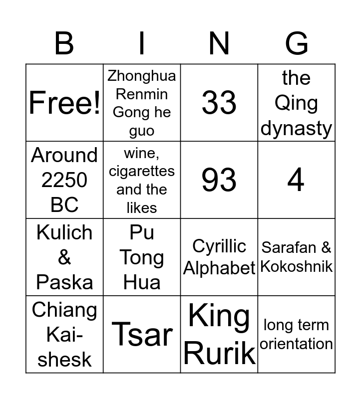 This bingo card has 16 words: Chiang Kai-shesk, Tsar, 33, the Qing dynasty, Around 2250 BC, Zhonghua Renmin Gong he guo, Cyrillic Alphabet, Sarafan & Kokoshnik, Free!, wine, cigarettes and the likes, King Rurik, 4, Kulich & Paska, Pu Tong Hua, 93 and long term orientation.