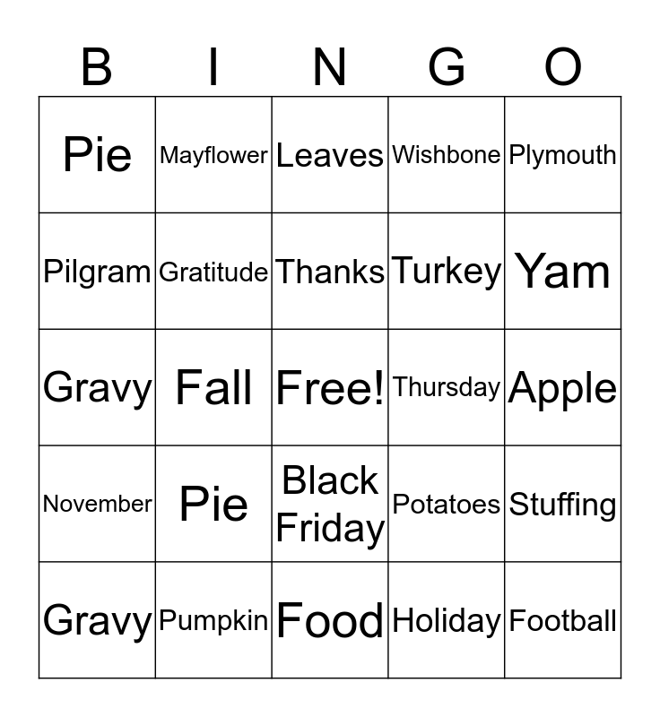 This bingo card has a free space and 24 words: Pie, Pumpkin, Thanks, Gravy, Plymouth, Pie, Pilgram, Mayflower, Thursday, Black Friday, Turkey, Gravy, Potatoes, Stuffing, Gratitude, Holiday, Apple, Leaves, Yam, Fall, Football, November, Wishbone and Food.