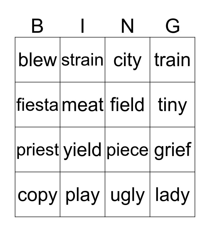 This bingo card has 24 words: Free!, thief, tiny, body, fiesta, blew, meat, strain, play, threw, priest, piece, only, very, field, brief, ugly, city, yield, grief, copy, lady, train and gray.