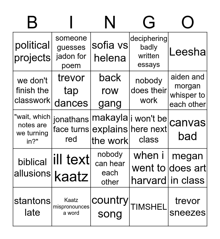This bingo card has a free space and 24 words: ill text kaatz, Kaatz mispronounces a word, back row gang, stantons late, Leesha, political projects, we don't finish the classwork, someone guesses jadon for poem, i won't be here next class, nobody can hear each other, nobody does their work, "wait, which notes are we turning in?", when i went to harvard, megan does art in class, trevor tap dances, TIMSHEL, canvas bad, sofia vs helena, aiden and morgan whisper to each other, jonathans face turns red, trevor sneezes, biblical allusions, deciphering badly written essays and country song.