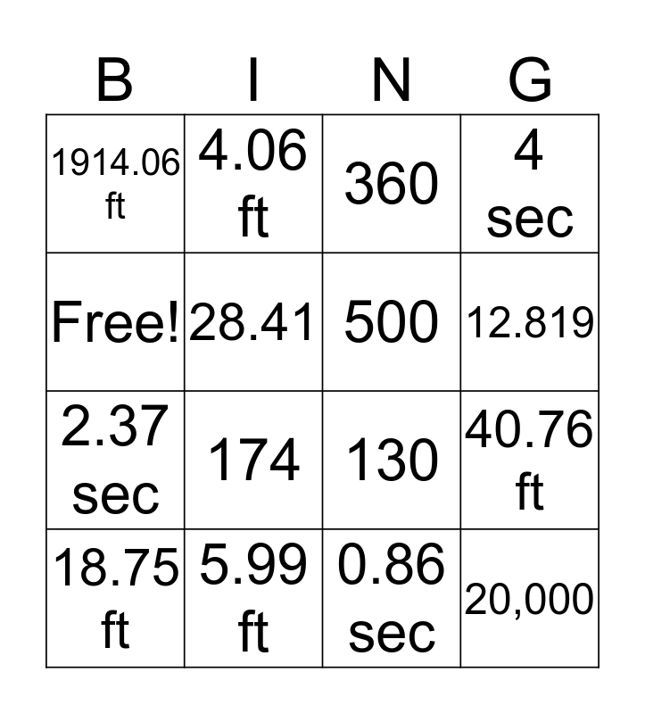 This bingo card has 16 words: 5.99 ft, 40.76 ft, 360, 1914.06 ft, 2.37 sec, 4.06 ft, 130, 0.86 sec, Free!, 28.41, 18.75 ft, 4 sec, 174, 12.819, 500 and 20,000.