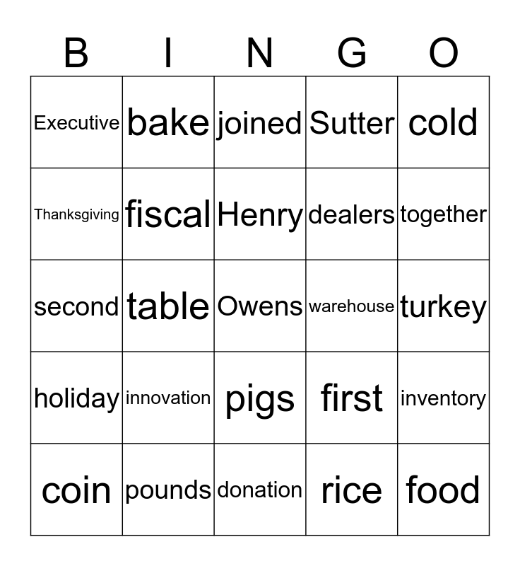 This bingo card has 38 words: excellence, achieved, operating, fiscal, inventory, innovation, Henry, AvKare, cold, dealers, table, Sutter, Owens, turkey, Thanksgiving, holiday, team, joined, packaging, warehouse, Executive, pounds, together, coin, dollars, donation, food, jar, penny, wars, egg, pigs, rice, bake, manufacturing, first, second and third.