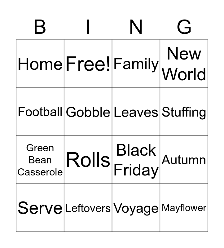 This bingo card has 32 words: Thankful, Wishbone, Autumn, Turkey, Mayflower, Leaves, Football, Cornucopia, Free!, Cranberries, Stuffing, Family, Dessert, Harvest, Leftovers, Novemeber, Orchard, Black Friday, Pecan, Roast, Squash, Thursday, Voyage, Yams, Serve, New World, Green Bean Casserole, Gobble, Home, Pumpkin Pie, Bake and Rolls.