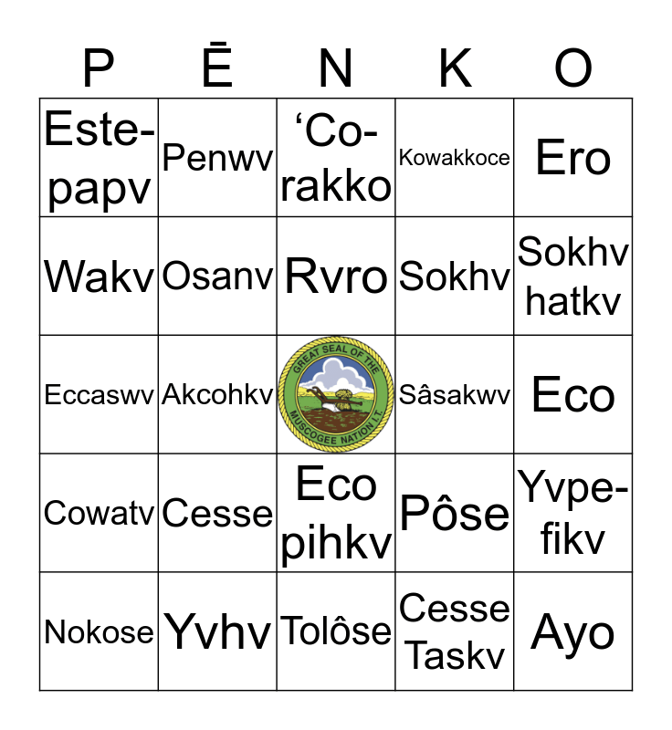 This bingo card has a free space and 27 words: Pôse, Efv, Sokhv, Tolôse, Wakv, ‘Co-rakko, Penwv, Cowatv, Sâsakwv, Yvpe-fikv, Eccaswv, Kowakkoce, Nokose, Yvhv, Sokhv hatkv, Wotko, Osanv, Rvro, Cesse, Este-papv, Eco, Cesse Taskv, Akcohkv, Ayo, Eco pihkv, Ero and Fuswv.