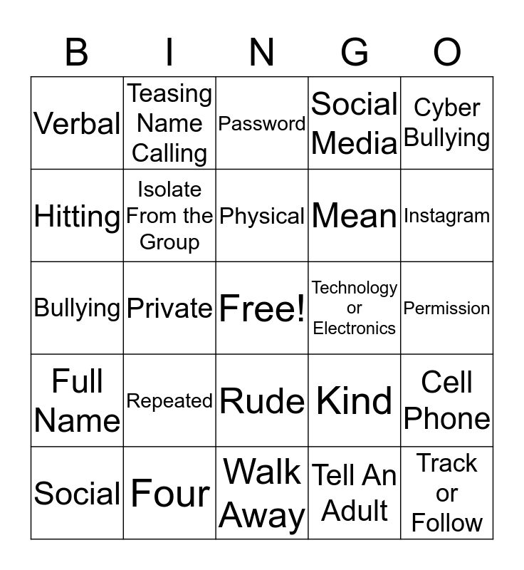 This bingo card has a free space and 24 words: Repeated, Four, Physical, Social, Cyber Bullying, Verbal, Hitting, Teasing Name Calling, Technology or Electronics, Rude, Mean, Bullying, Kind, Cell Phone, Isolate From the Group, Tell An Adult, Permission, Password, Instagram, Private, Track or Follow, Full Name, Social Media and Walk Away.