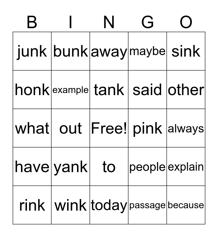 This bingo card has a free space and 24 words: yank, wink, tank, rink, sink, junk, honk, bunk, pink, to, said, what, people, explain, example, passage, always, away, other, out, because, have, maybe and today.