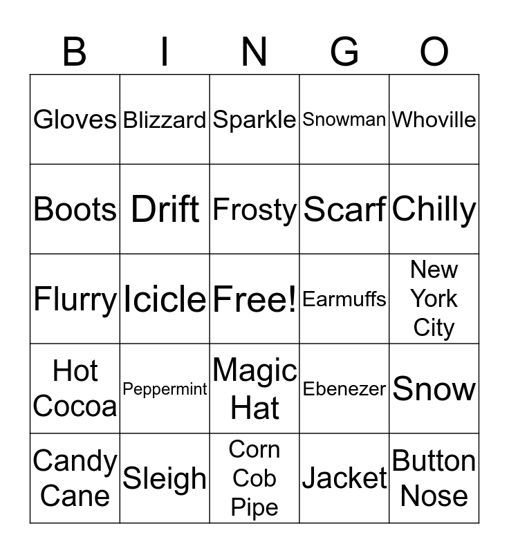This bingo card has a free space and 28 words: Snow, Mittens, Scarf, Jacket, Boots, Sparkle, Blizzard, Hot Cocoa, Earmuffs, Candy Cane, Flurry, Snowman, Sleigh, Corn Cob Pipe, Chilly, Frost, Peppermint, Drift, Frosty, Magic Hat, Gloves, Glitter, Button Nose, Icicle, New York City, Ebenezer, Whoville and Buddy.
