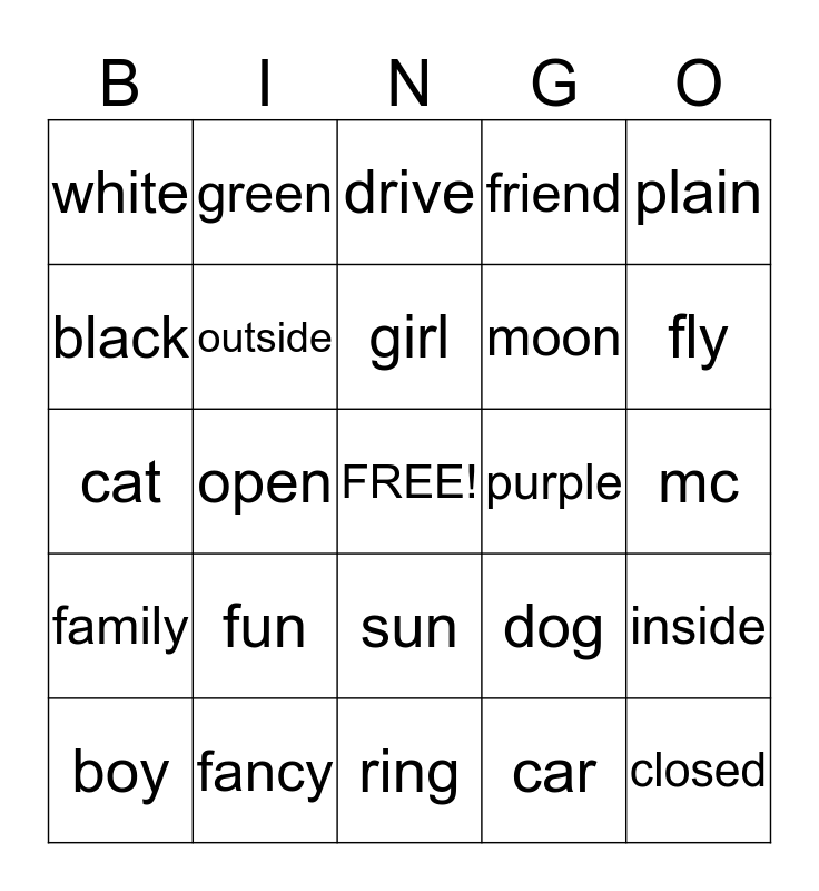 This bingo card has a free space and 24 words: fun, fancy, girl, boy, plain, white, black, green, purple, sun, moon, cat, dog, inside, outside, car, mc, drive, fly, open, closed, family, friend and ring.