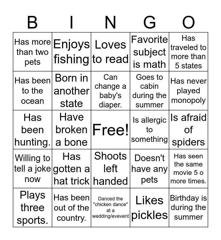 This bingo card has a free space and 24 words: Has gotten a hat trick, Has been out of the country., Can change a baby's diaper., Plays three sports., Has traveled to more than 5 states, Has more than two pets, Has been to the ocean, Enjoys fishing, Is allergic to something, Shoots left handed, Goes to cabin during the summer, Has been hunting., Doesn't have any pets, Has seen the same movie 5 o more times., Born in another state, Likes pickles, Is afraid of spiders, Loves to read, Has never played monopoly, Have broken a bone, Birthday is during the summer, Willing to tell a joke now, Favorite subject is math and Danced the "chicken dance" at a wedding/evevent.