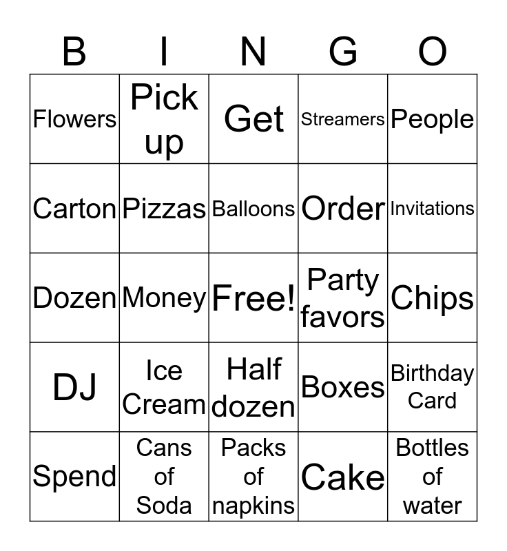 This bingo card has a free space and 24 words: Ice Cream, Cans of Soda, Balloons, Spend, People, Flowers, Carton, Pick up, Party favors, Half dozen, Order, Dozen, Boxes, Birthday Card, Pizzas, Cake, Chips, Get, Invitations, Money, Bottles of water, DJ, Streamers and Packs of napkins.