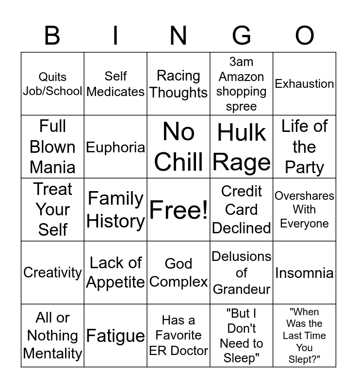 This bingo card has a free space and 24 words: All or Nothing Mentality, Lack of Appetite, No Chill, "But I Don't Need to Sleep", Exhaustion, Quits Job/School, Self Medicates, Racing Thoughts, Credit Card Declined, Overshares With Everyone, Treat Your Self, Euphoria, Delusions of Grandeur, Insomnia, Full Blown Mania, Fatigue, Has a Favorite ER Doctor, 3am Amazon shopping spree, Life of the Party, Creativity, Family History, God Complex, Hulk Rage and "When Was the Last Time You Slept?".