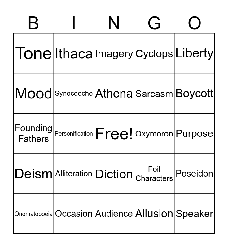 This bingo card has a free space and 29 words: Onomatopoeia, Metaphor, Personification, Simile, Tone, Imagery, Synecdoche, Alliteration, Oxymoron, Occasion, Purpose, Speaker, Audience, Allusion, Boycott, Ideology, Diction, Deism, Liberty, Founding Fathers, Foil Characters, Balance of Powers, Sarcasm, Mood, Cyclops, Ithaca, Poseidon, Athena and Zeus.