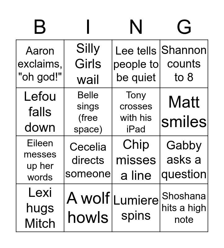 This bingo card has 16 words: A wolf howls, Gabby asks a question, Lee tells people to be quiet, Aaron exclaims, "oh god!", Eileen messes up her words, Silly Girls wail, Chip misses a line, Lumiere spins, Lefou falls down, Belle sings (free space), Lexi hugs Mitch, Shannon counts to 8, Cecelia directs someone, Matt smiles, Tony crosses with his iPad and Shoshana hits a high note.