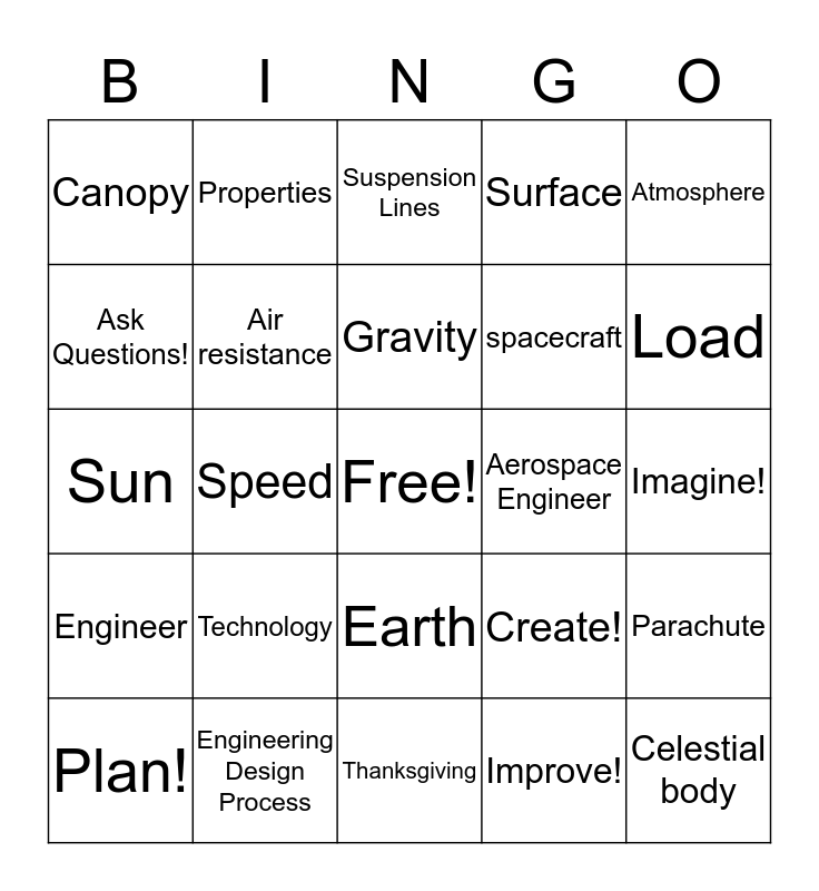 This bingo card has a free space and 24 words: Technology, Engineering Design Process, Gravity, Plan!, Atmosphere, Canopy, Ask Questions!, Properties, Aerospace Engineer, Earth, spacecraft, Sun, Create!, Parachute, Air resistance, Improve!, Imagine!, Suspension Lines, Load, Speed, Celestial body, Engineer, Surface and Thanksgiving.