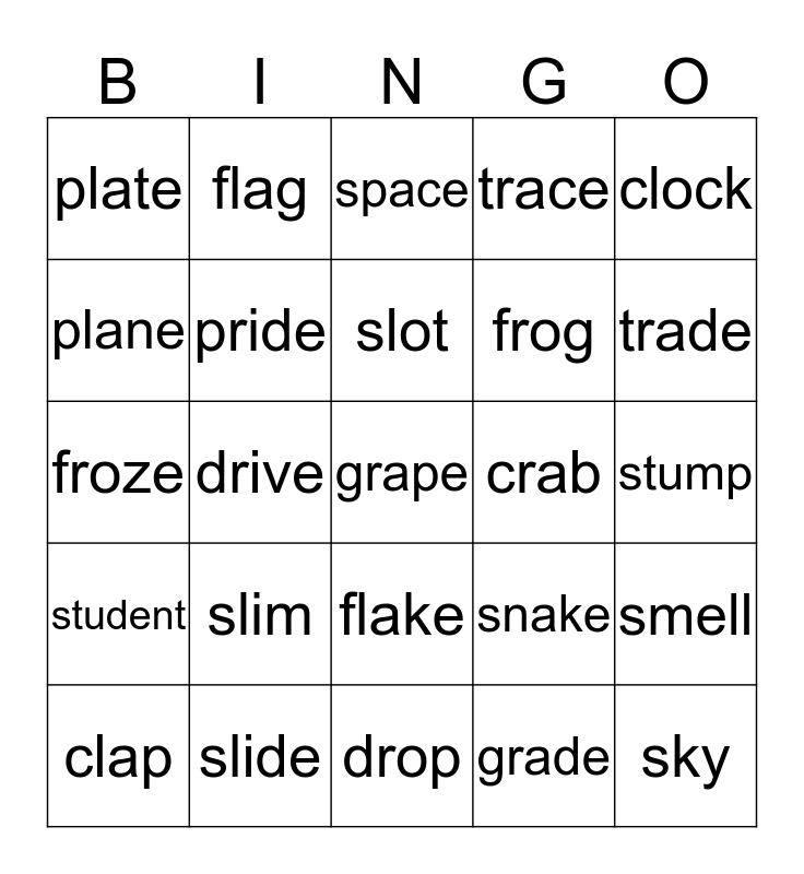 This bingo card has a free space and 24 words: slim, slide, slot, clap, clock, plate, plane, flag, crab, flake, frog, froze, snake, smell, pride, grade, stump, space, trade, drive, sky, student, trace and drop.