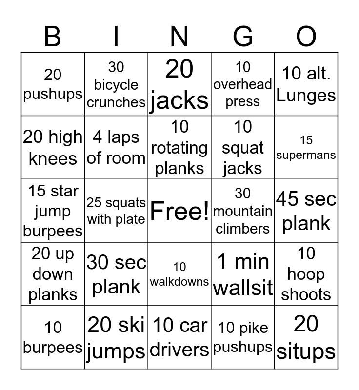 This bingo card has a free space and 29 words: 10 burpees, 10 frog to the dog, 25 squats with plate, 1 min wallsit, 20 pushups, 20 jacks, 4 laps of room, 30 sec plank, 30 mountain climbers, 20 ski jumps, 45 sec plank, 20 situps, 10 car drivers, 10 pike pushups, 15 supermans, 20 plank jacks, 10 walkdowns, 20 up down planks, 10 alt. Lunges, 15 star jump burpees, 1 min wallsit, 10 air punch hooks, 10 squat jacks, 20 high knees, 10 overhead press, 30 bicycle crunches, 10 hoop shoots, 10 rotating planks and Waterbreak.