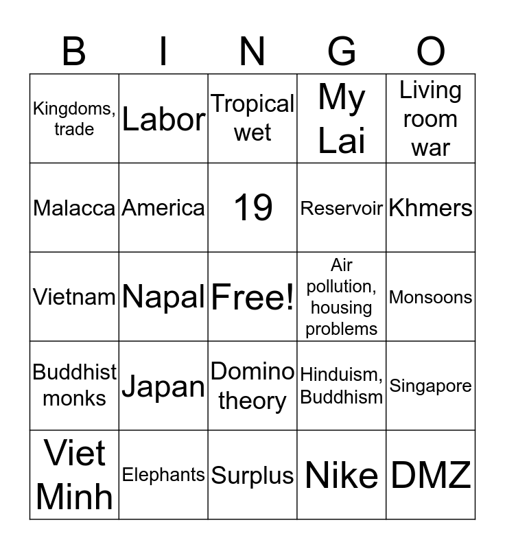 This bingo card has a free space and 39 words: Rohingya, VietCong, Ho Chi Minh, America, Viet Minh, Domino theory, 19, One year, Living room war, Buddhist monks, Napal, My Lai, DMZ, Monsoons, Air pollution, housing problems, Japan, River valleys, Kingdoms, trade, India, Hinduism, Buddhism, Malacca, Surplus, Reservoir, Khmers, Mongols, Elephants, Tet Offensive, Stop Communism, Human trafficking, Labor, Archipelago, 120, Tropical wet, Elephants, Nike, Pacific, Singapore, Vietnam and Tsunami.
