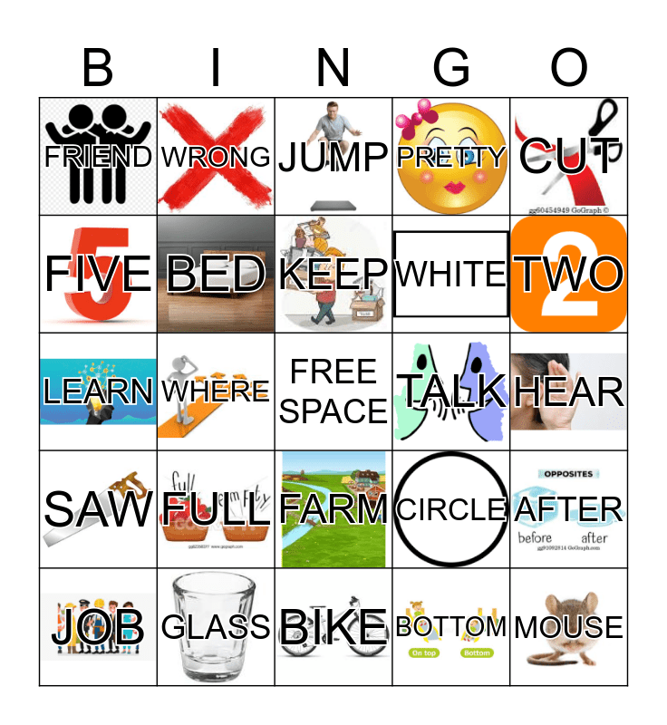 This bingo card has 24 images, a free space and 24 words: FULL, GLASS, KEEP, JOB, CUT, FRIEND, FIVE, WRONG, TALK, FARM, WHITE, LEARN, CIRCLE, AFTER, BED, BOTTOM, HEAR, JUMP, TWO, WHERE, MOUSE, SAW, PRETTY and BIKE.