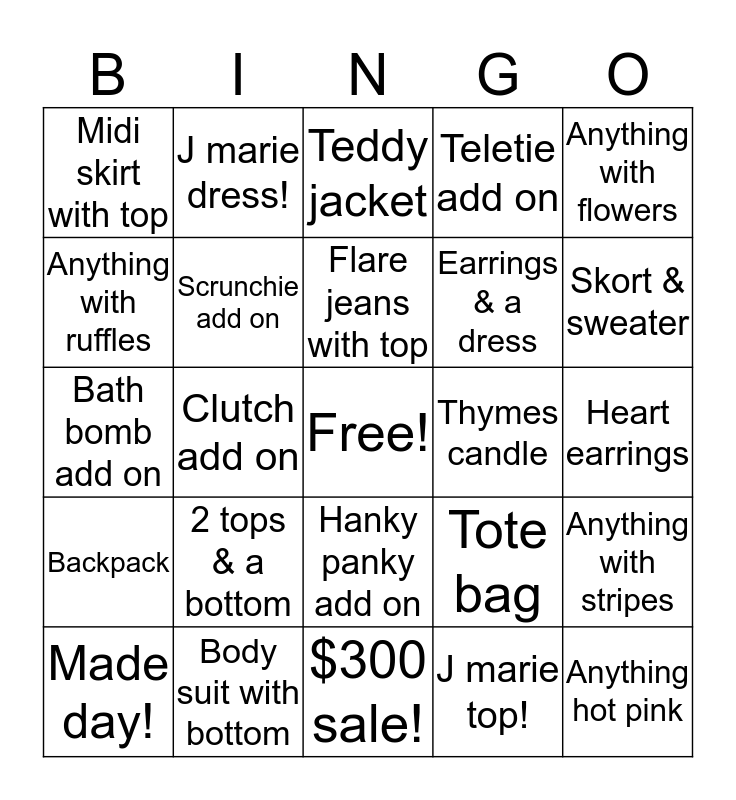 This bingo card has a free space and 38 words: Anything leopard print, Wallet add on, Sold what you're wearing, Scrunchie add on, Anything with stripes, 2 tops & a bottom, Flare jeans with top, Just black denim, Anything with flowers, Earrings & a dress, Clutch add on, Teletie add on, Anything hot pink, Heart earrings, Anything with ruffles, Backpack, Cheetah jacket, Teddy jacket, Volcano candle, Thymes candle, Midi skirt with top, Body suit with bottom, Skort & sweater, Made day!, Made quality!, $300 sale!, $500 sale!!, Anything snakeskin, Jacket add on, Thanksgiving outfit, Headband outfit, Hanky panky add on, J marie top!, J marie dress!, Hat add on, Tote bag, Bath bomb add on and Necklace add on.