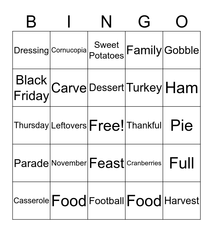 This bingo card has a free space and 24 words: November, Food, Dessert, Casserole, Gobble, Dressing, Black Friday, Cornucopia, Thankful, Feast, Turkey, Thursday, Cranberries, Full, Carve, Food, Pie, Sweet Potatoes, Ham, Leftovers, Harvest, Parade, Family and Football.