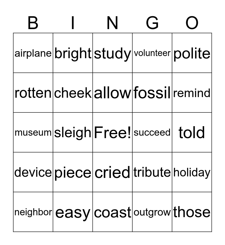 This bingo card has a free space and 29 words: neighbor, escape, sleigh, behave, airplane, study, cheek, piece, succeed, easy, told, those, coast, outgrow, remind, night, cried, device, polite, museum, tribute, victim, fossil, rotten, volunteer, bright, holiday, allow and decay.