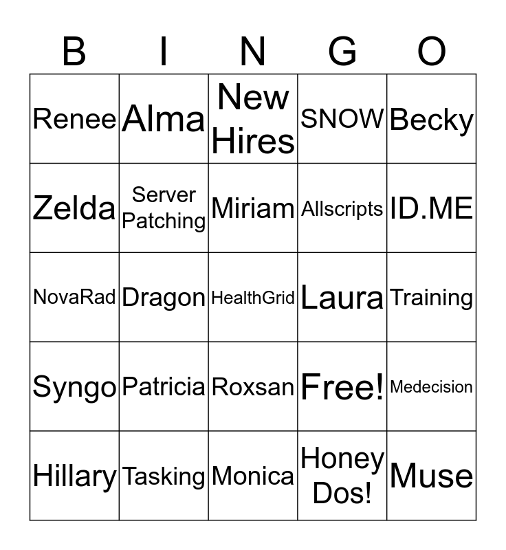 This bingo card has 25 words: Patricia, Monica, Miriam, Hillary, Becky, Renee, Zelda, Alma, Laura, Roxsan, Allscripts, NovaRad, Free!, Medecision, Server Patching, Muse, Training, New Hires, ID.ME, Dragon, HealthGrid, Tasking, Syngo, SNOW and Honey Dos!.