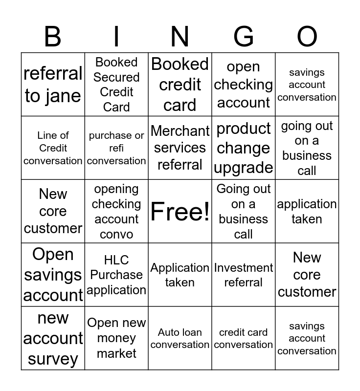 This bingo card has a free space and 24 words: HLC Purchase application, Open new money market, Merchant services referral, new account survey, savings account conversation, referral to jane, Line of Credit conversation, Booked Secured Credit Card, Going out on a business call, Application taken, product change upgrade, New core customer, Investment referral, New core customer, purchase or refi conversation, credit card conversation, application taken, Booked credit card, going out on a business call, opening checking account convo, savings account conversation, Open savings account, open checking account and Auto loan conversation.