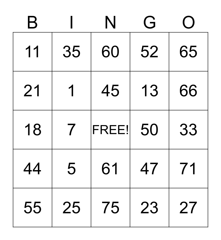 This bingo card has a free space and 24 words: 5, 25, 45, 55, 65, 11, 21, 35, 50, 61, 13, 18, 47, 71, 1, 23, 33, 60, 66, 7, 27, 44, 52 and 75.