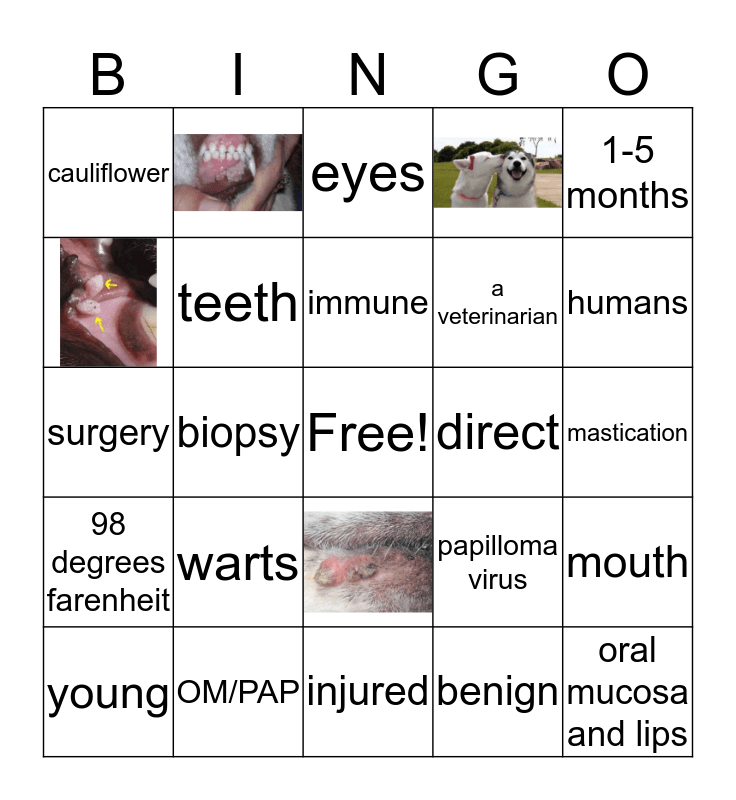 This bingo card has 5 images, a free space and 24 words: neoplasia, OM/PAP, eyes, resorbing, 1-5 months, cauliflower, teeth, immune, direct, mouth, young, biopsy, benign, oral mucosa and lips, surgery, canine, injured, papilloma virus, humans, 98 degrees farenheit, warts, antibiotics, a veterinarian and mastication.
