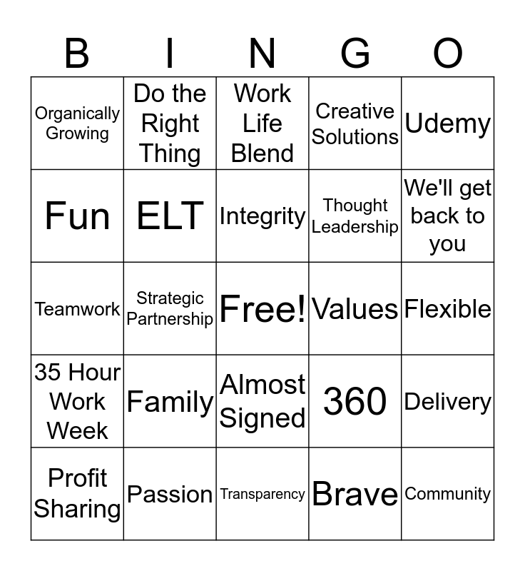 This bingo card has a free space and 24 words: Family, Passion, Integrity, Profit Sharing, Udemy, Organically Growing, Fun, Do the Right Thing, Values, Almost Signed, Thought Leadership, Teamwork, 360, Delivery, ELT, Brave, Flexible, Work Life Blend, We'll get back to you, Strategic Partnership, Community, 35 Hour Work Week, Creative Solutions and Transparency.