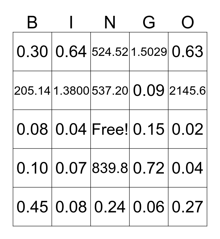 This bingo card has a free space and 35 words: 572.88, 756.0, 576.0, 1.3800, 839.8, 1.5029, 205.14, 58.33, 537.20, 27.580, 0.08, 0.63, 0.18, 0.48, 0.30, 0.15, 0.06, 0.04, 0.10, 0.27, 0.72, 0.45, 0.04, 0.08, 524.52, 2145.6, 7708.0, 0.68579, 0.09, 0.02, 0.03, 0.24, 0.07, 0.64 and 0.01.