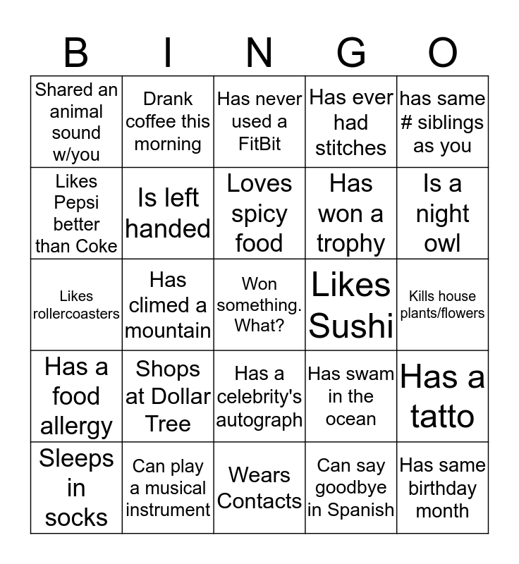 This bingo card has a free space and 24 words: Shops at Dollar Tree, Can play a musical instrument, Loves spicy food, Sleeps in socks, has same # siblings as you, Shared an animal sound w/you, Likes Pepsi better than Coke, Drank coffee this morning, Likes Sushi, Has a celebrity's autograph, Has won a trophy, Likes rollercoasters, Has swam in the ocean, Has a tatto, Is left handed, Can say goodbye in Spanish, Kills house plants/flowers, Has never used a FitBit, Is a night owl, Has climed a mountain, Has same birthday month, Has a food allergy, Has ever had stitches and Wears Contacts.