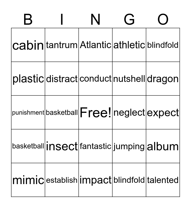 This bingo card has a free space and 24 words: insect, establish, conduct, mimic, blindfold, cabin, plastic, tantrum, neglect, fantastic, nutshell, punishment, jumping, album, distract, blindfold, expect, Atlantic, dragon, basketball, talented, basketball, athletic and impact.